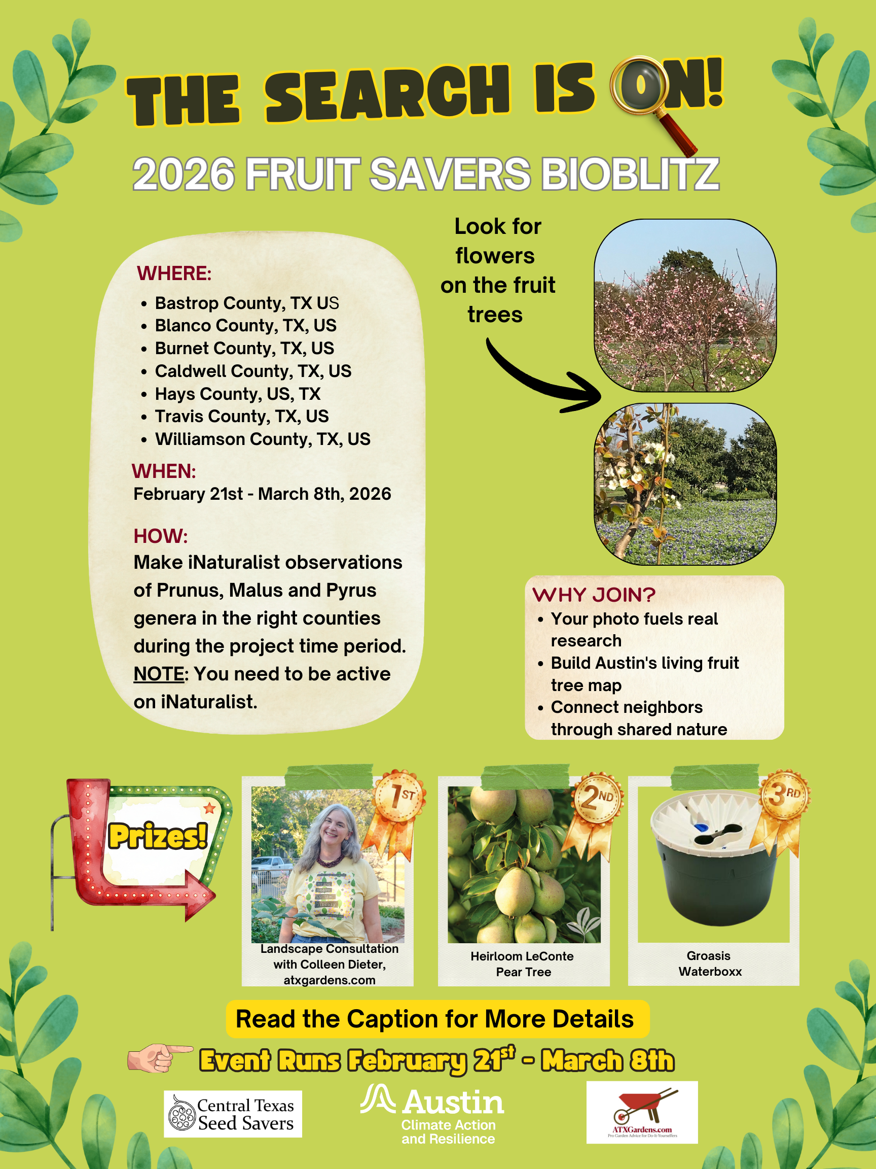 If you use INaturalist, please add your observations of fruit trees to our Heirloom Fruit Tree Preservation Project. Our INaturalist BioBlitz runs from Feb 21-March 8, 2026, brought to you by Central Texas Seed Savers, ATXGardens.com and Austin Urban Forest Grant.